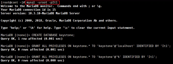 keystone데이터베이스에 대한 적절한 액세스 권한을 부여하고, KEYSTONE_DBPASS적절한 비밀번호로 교체한다.