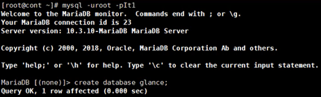 데이터베이스 액세스 클라이언트를 사용하여 root사용자 로서 데이터베이스 서버에 연결하고, glance데이터베이스를 작성한다.